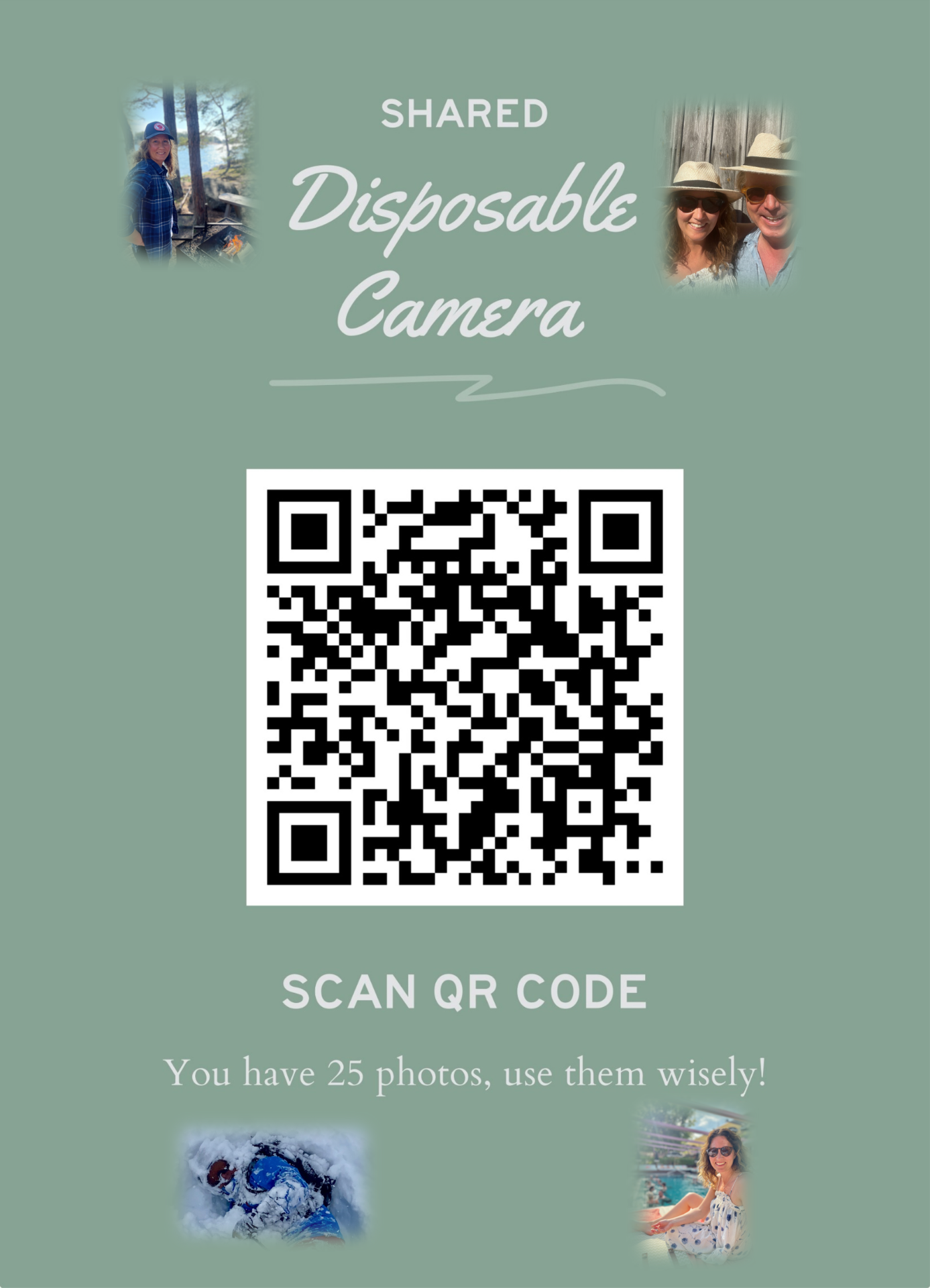 Engångskamera: Scanna koden med din mobilkamera och dela dina bästa ögonblick! Alla bilder samlas i ett gemensamt album som alla kan ta del av efteråt. Kom ihåg, du kan ladda upp max 25 bilder – välj dina favoriter med omsorg!